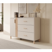 Dressoir Orvana is een opbergkast in moderne, hotelchique stijl. De kast beschikt over 1 deur en 3 lades. De deur heeft op de voorkant een latten patroon en hierachter zijn 2 opbergvakken te…
