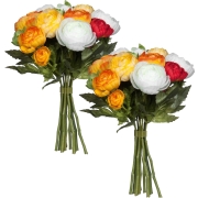 2x kunstbloemen boeket ranonkels 22 cm. in de kleur oranje/rood. Zeer realistisch uitziende, onderhoudsvrije ranonkels kunstbloemen boeket om los in een vaas te zetten op bijvoorbeeld je eettafel…