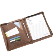 Handige, sterke conferentiemap van donkerbruin plantaardig gelooid leer met rits De Brighton is een handige en super sterke schrijfmap met aan de rechterkant ruimte voor een A5-…
