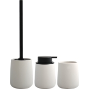 Badkamer accessoires set in het wit, bestaande uit een toiletborstel, drink/tandenborstel beker en een zeeppompje. De toiletborstel in houder/WC borstel is gemaakt van luxe kunststof met rvs steel…