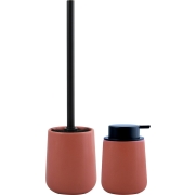 Badkamer accessoires set in het terracotta, bestaande uit een toiletborstel, drink/tandenborstel beker en een zeeppompje. De toiletborstel in houder/WC borstel is gemaakt van keramiek met rvs…