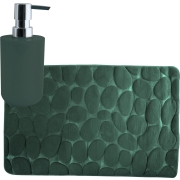 Badkamer droogloopmat/tapijtje met kiezel motief, laagpolig van microfibre met zelfde kleur zeeppompje. Kleur: donkergroen. Voor bij de wasbak of naast het bad, comfortabeler bij het uitstappen.…
