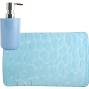 Badkamer droogloopmat/tapijtje met kiezel motief, laagpolig van microfibre met zelfde kleur zeeppompje. Kleur: lichtblauw. Voor bij de wasbak of naast het bad, comfortabeler bij het uitstappen.…