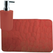 Badkamer droogloopmat/tapijtje met kiezel motief, laagpolig van microfibre met zelfde kleur zeeppompje. Kleur: terracotta. Voor bij de wasbak of naast het bad, comfortabeler bij het uitstappen.…