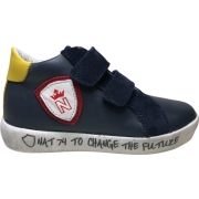 Hoge lederen sneakers met 2 plakkers Naturino Korey 2 High Calf Navy Stevig lederen bovendeel in navy met gele hiel als decoratie Een wit schildje met rode rand en rode…