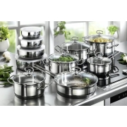 20-delige pannenset: koken, stoven, stomen en braden lukt met dit roestvrijstalen kookgerei kinderlijk eenvoudig.<br />