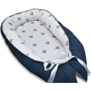 Een lief babynestje in de kleur blauw. Dit nestje wordt gemaakt van blauwe wafelkatoen in combinatie met wit katoen met een blauwe plusjes print. Onze babynestjes worden volledig met de hand gemaakt…