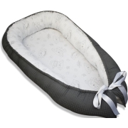 Een lief babynestje in de kleur grijs. Dit nestje wordt gemaakt van grijs wafelkatoen in combinatie met wit katoen met een lichtgrijze panda print. Het nestje sluit met een satijnen lint.…