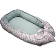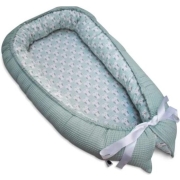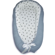 Babynest oudblauw met veertjes print. Dit nestje is voorzien van een stevig matrasje van 3 cm dik en 65 cm lang. De opstaande randen zijn gevuld met ademend fibre fill. Hierdoor kan je kindje niet…