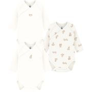 Setje van 3 unisex overslagrompertjes met lange mouwen in 1X1 ribstof, een elastische en comfortabele stof. Deze set bestaat uit één rompertje met beertjesprint en twee effen rompertjes met zeefdruk…