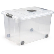 Opslagbakken / Opslagboxen organizers op wielen met deksel met een inhoud van 61 liter. Transparante opbergbakken met deksel welke is voorzien van sluitclips. Handig voor het opbergen van spullen…