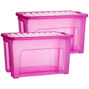 2x opslagbox/kist met zijklem deksel met inhoud van 47 liter. De opslagbox / opbergbox is in de kleur transparant roze en is gemaakt van stevig kunststof. Afmetingen: 54 x 38 x 32 cm. Handige…
