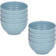 8x stuks kommetjes/schaaltjes voor o.a. dessert, ontbijt en hapjes/nootjes serveren. Ook te gebruiken kleine soepkommetjes. Gemaakt van stevig kunststof in de kleur ijsblauw. Afmeting: D13 x 7 cm/…