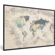 Fotolijst incl. Poster - Wereldkaart - Bruin - Krant - 120x80 cm - Posterlijst