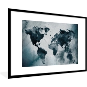 Fotolijst incl. Poster - Wereldkaart - Grijs - Blauw - 90x60 cm - Posterlijst