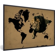 Fotolijst incl. Poster - Wereldkaart - Bruin - Leeuw - 90x60 cm - Posterlijst