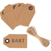 Setje van 100x stuks kartonnen beschrijfbare labels aan een jute touwtje, leuk om voorzien van een naam aan een cadeautje te hangen. Afmeting label: ca. 4.5 x 7,5 cm. Materiaal: karton.…