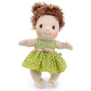 Karin met donker bruin haar is gekleed in een schattig groene trui en jurk. Ze is geschikt vanaf de geboorte. Het voordeel van de Rubensbarn cutie poppen is dat ze wasbaar zijn in de wasmachine…
