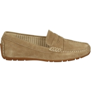 Flacher Damenslipper in Mokassin-Machart aus feinem Kalbvelour-Leder mit modischer Pennyloafer-Garnitur. Durchgehend textilgefüttert, mit weich gepolsterter Decksohle zum Herausnehmen und Austausch…