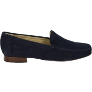 Flacher Damenslipper in Mokassin-Machart aus feinem Kalbvelour-Leder mit modischer Pennyloafer-Garnitur. Durchgehend textilgefüttert, mit weich gepolsterter Decksohle zum Herausnehmen und Austausch…
