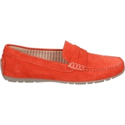Flacher Damenslipper in Mokassin-Machart aus feinem Kalbvelour-Leder mit modischer Pennyloafer-Garnitur. Durchgehend textilgefüttert, mit weich gepolsterter Decksohle zum Herausnehmen und Austausch…