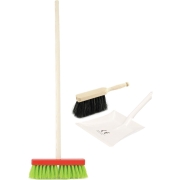 Speelgoed schoonmaak set. De set is inclusief een stoffer met zachte zwarte kunststof haren, een wit metalen stofblik en een buitenbezem. Materiaal stoffer: hout/kunststof. Materiaal stofblik:…