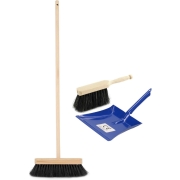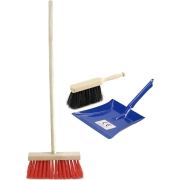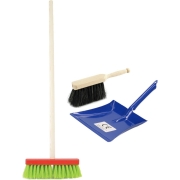 Speelgoed schoonmaak set. De set is inclusief een stoffer met zachte zwarte kunststof haren, een blauw metalen stofblik en een buitenbezem. Materiaal stoffer: hout/kunststof. Materiaal stofblik:…