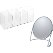 Make-up organizer met 4 vakjes in de kleur transparant samen met een ronde opmaak spiegel met 5x zoom in de kleur blauw. De rechthoekige plastic organizer heeft insteek vakjes voor uw make-up en…