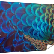 Gards Tuinposter Kleurrijke Pauw Veren van Dichtbij - 150x120 cm - Tuindoek - Tuindecoratie - Wanddecoratie buiten - Tuinschilderij