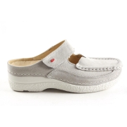 Wolky dames slipper artikel - Roll Slipper in het lichtgrijs leer. De kleur neigt meer naar mustard. De maakwijze is volledig leder en de slipper beschikt over een uitneembaar voetbed. De pasvorm…