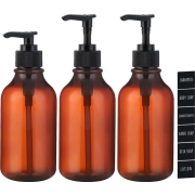 Lotion Dispenser, 3 stuks, 300 ml zeepdispenser met etiketten voor shampoo, vloeibare zeep, douchegel, afwasmiddeldispenser om te vullen, navulbare plastic fles voor keuken en badkamer, barnsteen