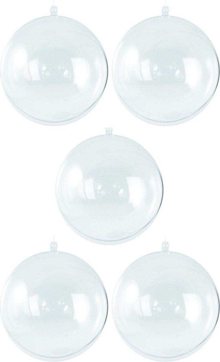 10x Plastic transparante bollen om zelf een kerstbal van te maken. De transparante bol zit verpakt per stuk en is ongeveer 10 cm in diameter. De twee losse helften kunt u op elkaar klikken nadat u er decoratie in heeft gedaan of in/op heeft bevestigd of u deze heeft beschilderd. Materiaal: kunststof. Formaat diameter: 10 cm. Zelf kerstballen maken hobbymaterialen basismateriaal.