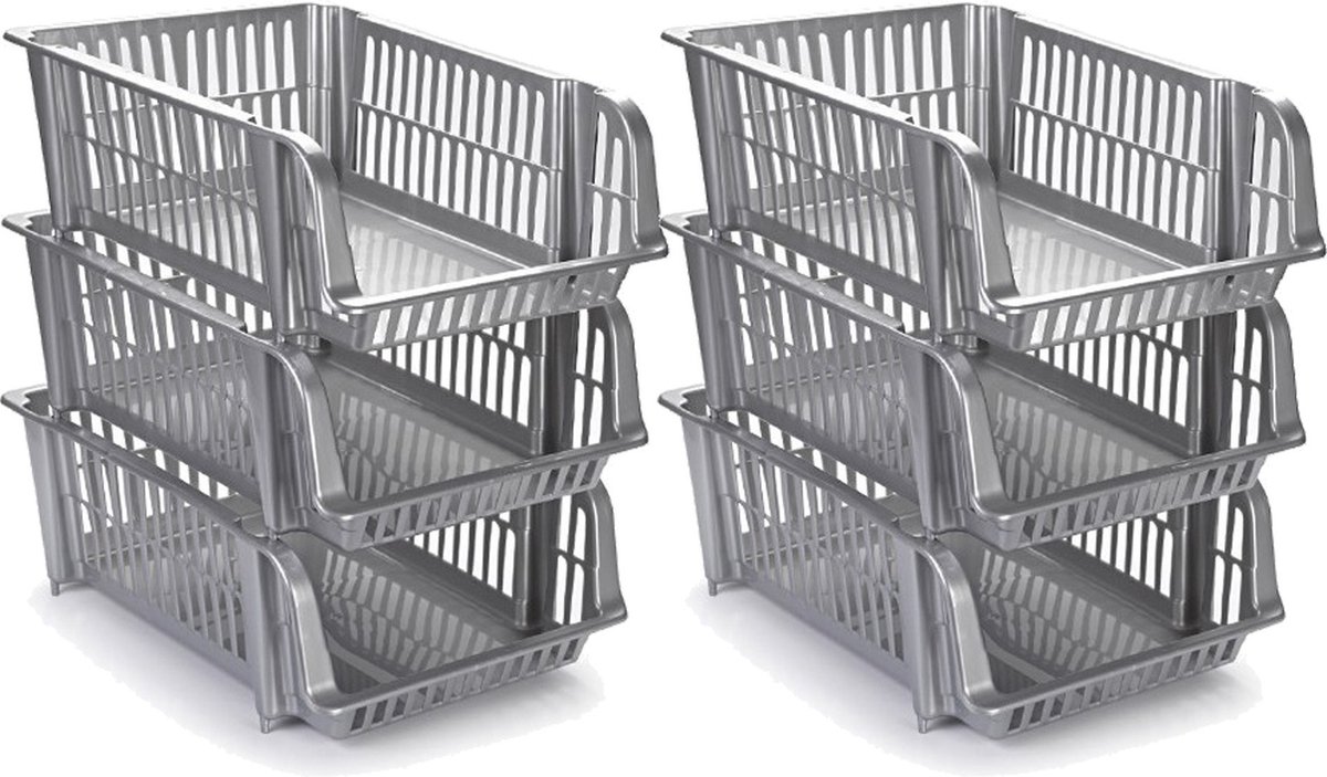 Zilvergrijze opbergmanden/opbergdozen/opbergboxen stapelbaar 20 liter kunststof. Deze opbergmanden zijn zo ontworpen dat ze op elkaar gestapeld kunnen worden, om zoveel opbergruimte te creëren als u nodig heeft. De manden hebben een simpel en stevig ontwerp en zijn geschikt voor het opbergen van allerlei spullen, zoals speelgoed, schoenen en tijdschriften. Ook ideaal voor in de badkamer of in de voorraadkast. Formaat: ongeveer 43 x 32 x 16,5 cm.