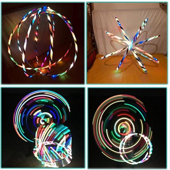 1. 24 Kleurwisselende LED's: Deze hoelahoep beschikt over maar liefst 24 LED-lampen die stroboscopische patronen en 10 verschillende heldere kleuren creëren. De hoepel wordt als een betoverende regenboog in de lucht, waardoor elke beweging een spectaculaire show wordt.
