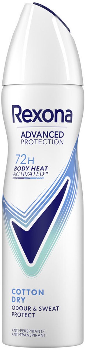 Over Rexona Women Advanced Protection Cotton Dry Anti-Transpirant Spray:Rexona Women Advanced Protection Cotton Dry Anti-Transpirant Spray met 0% alcohol* geeft je tot 72 uur effectieve en betrouwbare bescherming tegen transpiratie en ongewenste lichaamsgeur. Nu kun je je zelfverzekerde kant altijd naar boven halen.Met Body Heat Activated Technologie van Rexona zorgt deze anti-transpirant voor urenlange frisheid. Door deze technologie blijven microcapsules achter op het huidoppervlak die vervolgens worden geactiveerd door beweging. Wrijving maakt dat ze openbarsten als je beweegt, waardoor een explosie van een lichte, zuivere geur met bloemige noten vrijkomt. Zo blijf je de hele dag lekker fris ruiken. Houd je een speech op een topconferentie, ga je de Mont Blanc beklimmen of heb je gewoon een drukke dag op het werk? Wat je ook doet, je kunt erop rekenen dat Rexona jouw tempo zal bijhouden.De verbeterde Rexona Women Advanced Protection Cotton Dry Anti-Transpirant Spray geeft je betere bescherming tegen zweet. De lichte, rustgevende geur zal ervoor zorgen dat jij je altijd fris en zelfverzekerd voelt. Met Rexona verleg jij je grenzen: het laat je niet in de steek.Hoe te gebruiken: Goed schudden voor gebruik. Houd de deodorant ongeveer 15 centimeter van je oksel en spray gelijkmatig onder de oksels in een goed geventileerde ruimte. Vermijd contact met de ogen en beschadigde huid. Na gebruik kun je de spuitbus van deze deodorant recyclen, omdat hij gemaakt is van oneindig recyclebaar aluminium.Over Rexona: Transpireren doen we allemaal. Op sommige momenten is dat heel nuttig, maar vaak is het juist heel vervelend. Dan heb je behoefte aan een deodorant of anti-transpirant die je écht de juiste bescherming biedt. Rexona-verzorgingsproducten zijn slim ontworpen, zodat ze net zo hard werken als jij. Rexona houdt zich namelijk al jaren bezig met alles wat met zweet te maken heeft. Die kennis heeft geleid tot een uitgebreide lijn met effectieve anti-transpirant deodorants die ervoor zorgen dat je de hele dag droog en fris blijft. Rexona is er in verschillende varianten, met een anti-transpirant en deodorant voor mannen en vrouwen, in spray, roller, stick en crème. Kortom, voor elk wat wils.*Ethylalcohol.