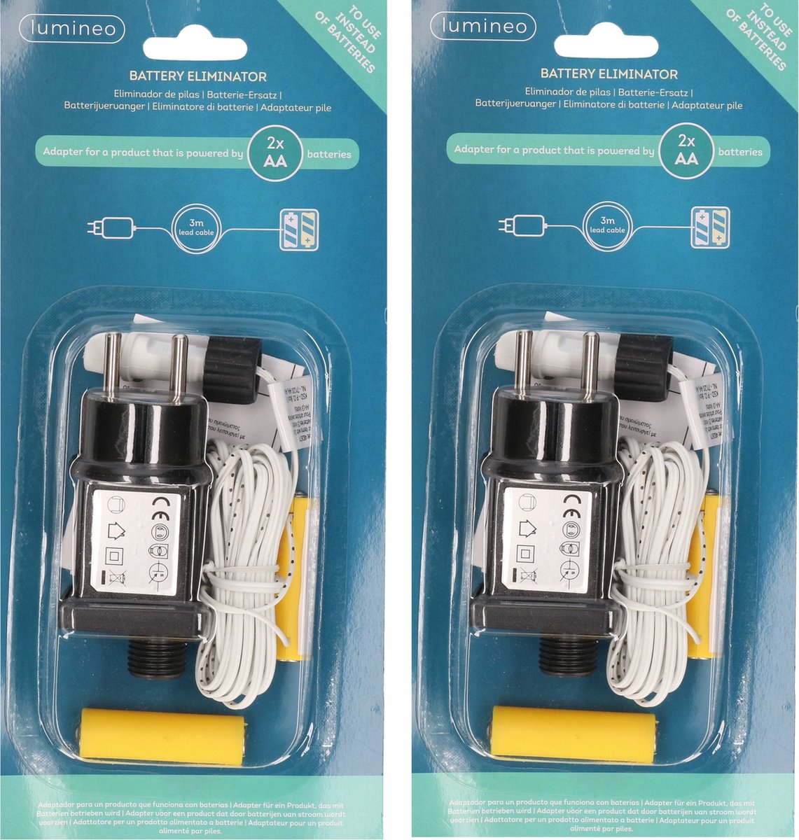 Set van 3x Adapter 2x AA batterij vervanger. Met deze batterijvervanger hoeft u nooit meer batterijen te kopen. De 2x AA batterijen werken op stroom. U kunt snel leeglopende batterijen vervangen door deze batterijvervanger en het product ook eventueel aansluiten op een aan/uit kliksysteem. Het aanloopsnoer heeft een lengte van ongeveer 300 cm. IP klasse: IP-20. Stekker type: EU.