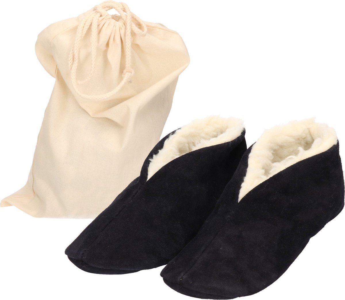 Navy dames Spaanse sloffen uit Spanje. Deze echte Spaanse sloffen zijn gemaakt van 100% kwaliteits suede en zijn van uitstekende kwaliteit. Deze sloffen zijn iets hoger dan de reguliere Spaanse sloffen waardoor ze een betere pasvorm hebben. De binnen voering is van zacht materiaal gemaakt met 20% wol. Voor een optimaal loopcomfort zit er tussen het suede en de voering een dikke vilten tussenzool.