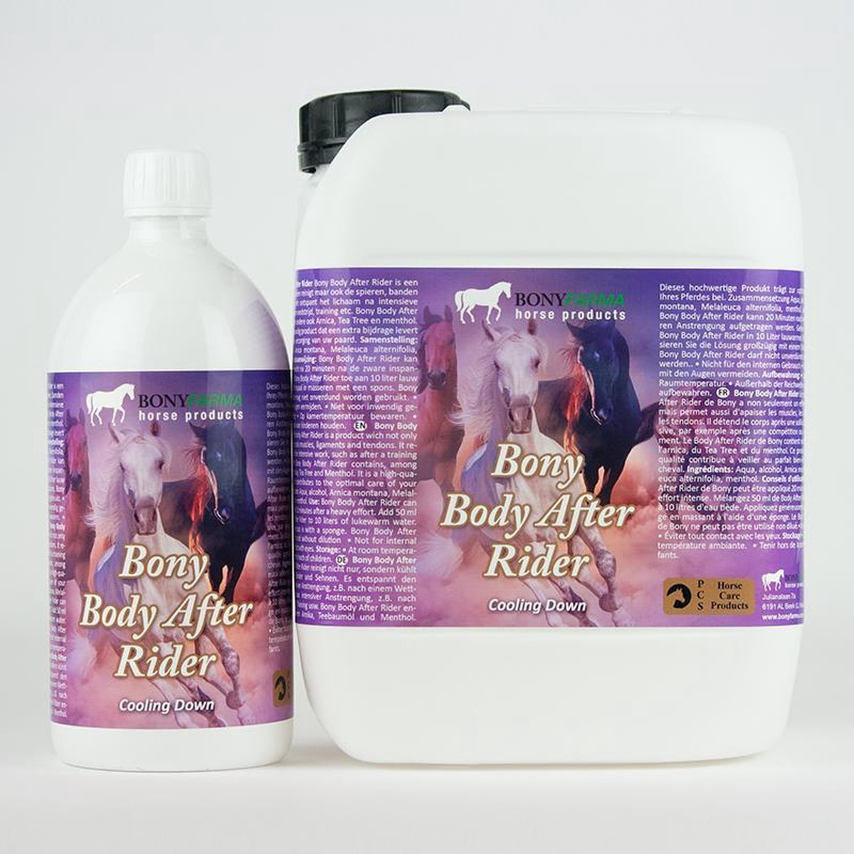 Bony Body After Rider is een product dat niet alleen reinigt maar ook de spieren, banden en pezen koelt. Het ontspant het lichaam na intensieve arbeid zoals na een wedstrijd, training etc. Bony Body After Rider bevat onder andere ook Arnica, Tea Tree en menthol. Dit is een hoogwaardig product dat een extra bijdrage levert aan de optimale verzorging van uw paard. Dit product was voorheen bekend onder de naam PCS Cojosol Body After Rider.