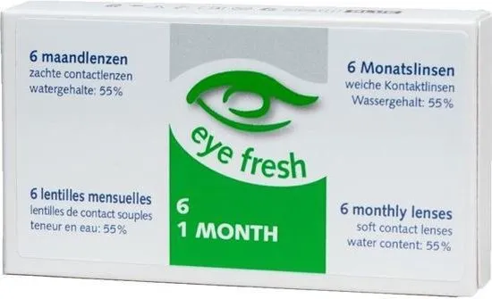 Eye Fresh maandlenzen zijn verpakt per 6 stuks en verkrijgbaar in de sterktes van -1,00 t/m -6,00.Maandlenzen zijn erg populair en de meest verkochte lenzen. Logisch, want u heeft maar twaalf paar nodig per jaar en daardoor zijn maandlenzen een voordelige keuze. Maandlenzen zijn makkelijk, duurzaam en voordelig. Ook wanneer je een bril draagt zijn maandlenzen ideaal. Je kunt de contactlenzen makkelijk afwisselen. Eye Fresh zachte maandlenzen zijn kwalitatief hoogwaardige contactlenzen. Ze zijn gemaakt van Filcon 4, ionisch en hebben een hoog watergehalte van 55%. Dankzij het hoge watergehalte ervaar je dagelijks een optimaal zicht en een prettig draagcomfort. De zachte contactlenzen voldoen aan alle wettelijke eisen en hebben een CE markering. Belangrijkste kenmerken:• Maandlenzen zijn voordelig• Zachte contactlenzen met sterkte• Hoog watergehalte van 55%• Materiaal is Filcon 4, ionischGebruik:Eye Fresh maandlenzen zijn makkelijk in te brengen. Leg de Eye Fresh contactlens deze in uw handpalm. Giet nu enkele druppels Eye Fresh lenzenvloeistof op de contactlens en plaats deze in uw oog. Voor het reinigen haal je de contactlens uit het oog en leg deze op uw handpalm. Giet nu enkele druppels en wrijf met uw wijsvinger de contactlens voorzichtig schoon. Spoel de contactlens af met de lenzenvloeistof en plaats deze in een platte lenshouder. Vul de lenshouder met Eye Fresh lenzenvloeistof.