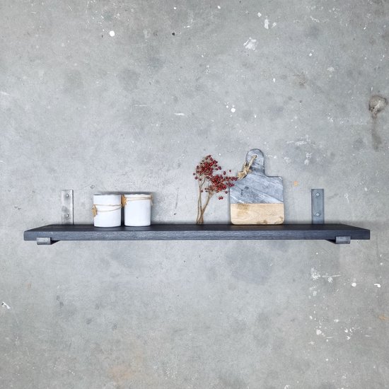 Industriële plankdragers met eiken wandplank, inclusief bevestigingsmaterialen. De plank heeft een robuuste uitstraling. Uniek door z’n eigen noesten, vlekken en scheuren. Een sfeervolle aanwinst voor je interieur. Ook leuk als boekenplank!