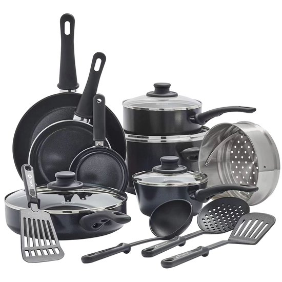 COOCK 19-Delige Pannenset - Speciale Anti-Aanbak Coating - Ergonomische Handgrepen - Gerecycled Aluminium- Zwart - Inclusief Onderzetters en E-book