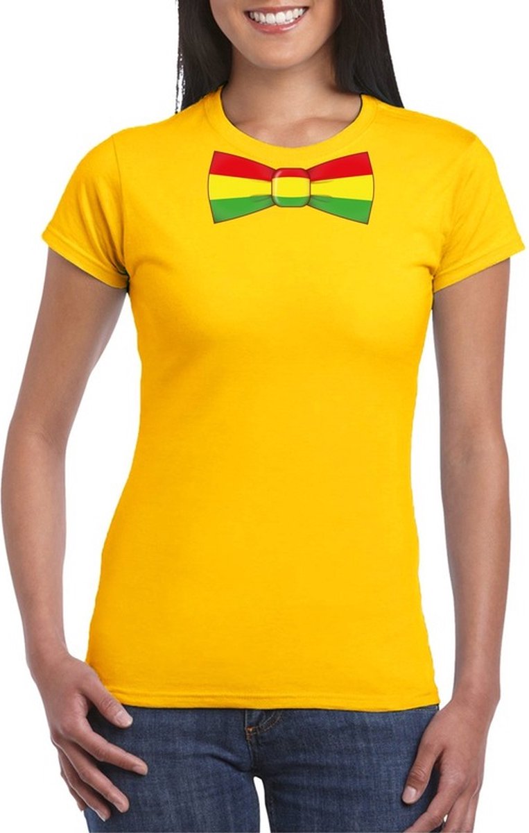 Groen t-shirt met strikje in de kleuren van de Limburgse vlag voor dames. Leuk shirt voor het Limburgse carnavalsfeest. Materiaal: 150 grams, 100% katoen.