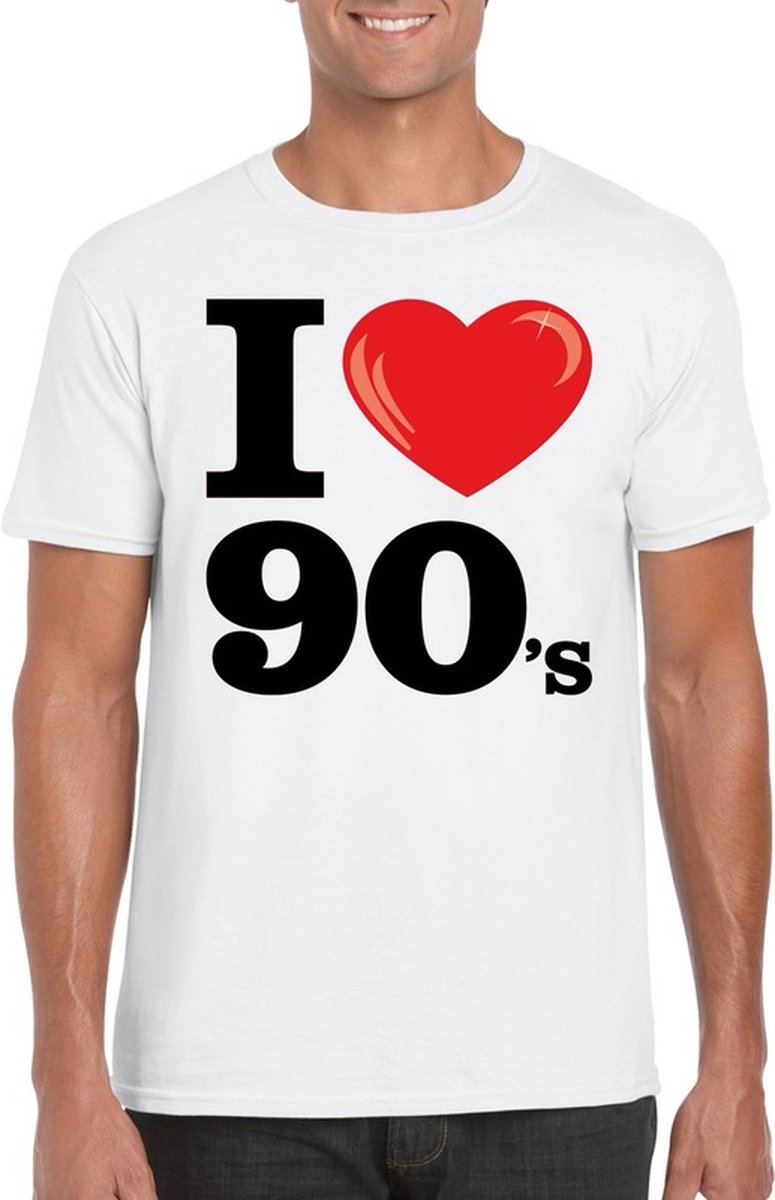 I love 90's t-shirt wit voor heren. Op dit shirt staat I hartje 90's. Materiaal: 150 grams, 100% katoen.