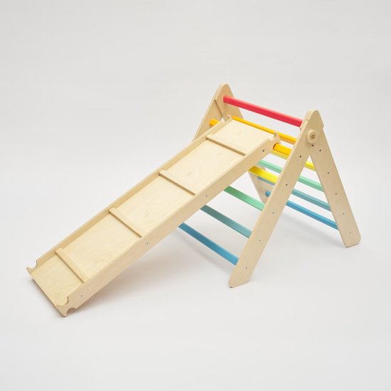 Juliard.Club Pikler driehoek 72cm met dubbelzijdige glijbaan/klimbord kleurrijk , klimtoestel voor peuters en kleuters