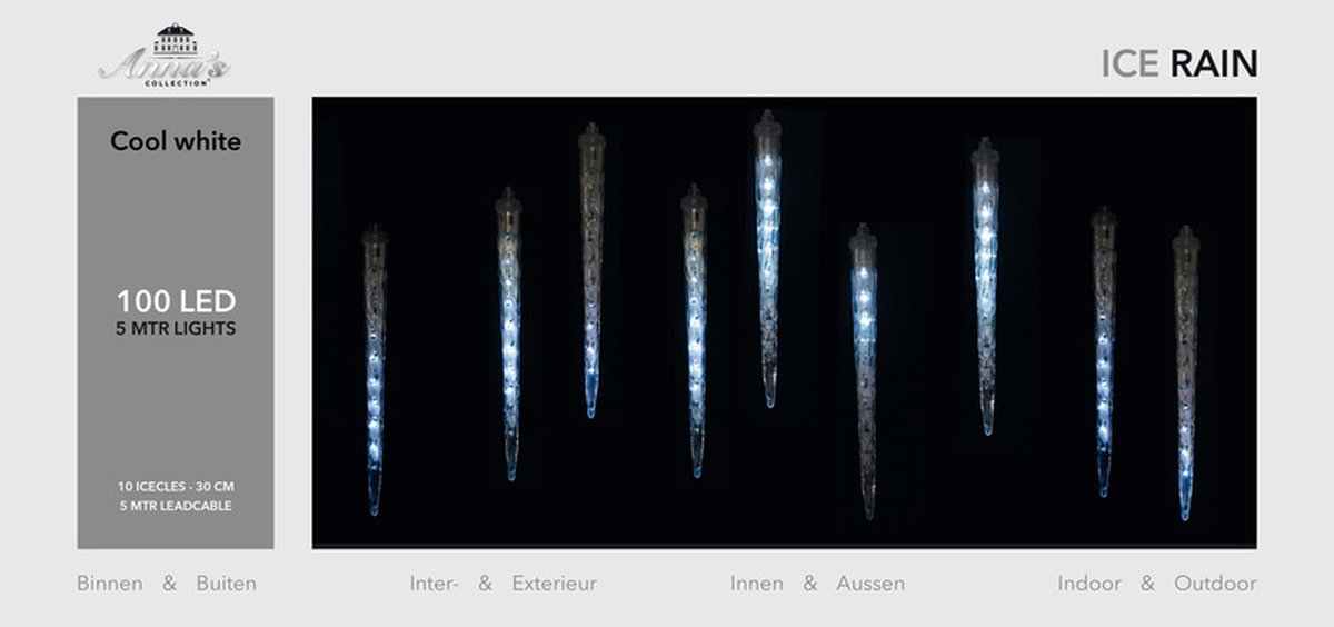 Kerstverlichting LED ijspegelverlichting 360 lampjes warm wit 720 x 60 meter IP44. Transparante ijspegelverlichting met 360 warm witte leds verdeeld over meerdere strengen in verschillende lengtes waarvan de langste 60 cm is. Het lichtsnoer heeft een automatische timer met aan/uit functie, in te stellen per 8 of 16 uur.