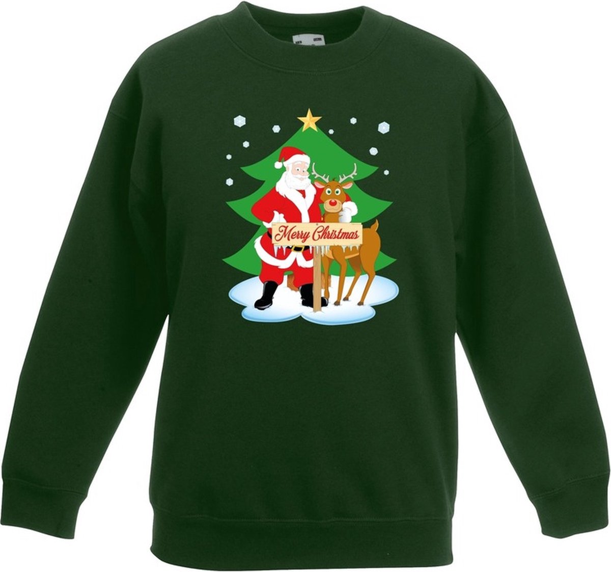 Kersttrui kerstman en rendier zwart voor jongens en meisjes. De sweater is bedrukt met een afbeelding van een kerstman en rendier rudolf voor een kerstboom en de tekst Merry Christmas. Materiaal: 80% katoen en 20% polyester (260 grams)