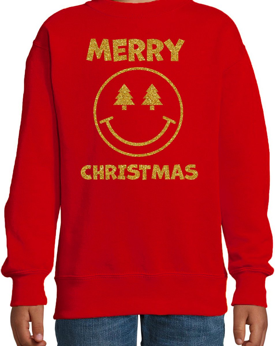 Kersttrui/sweater voor jongens/meisjes - Merry Christmas - rood - Smile Emoticon - glitter goud 7-8 jaar (122/128) -
