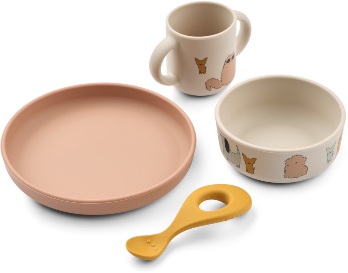 - Set bevat: een drinkbeker, een kom, een bord en een lepel