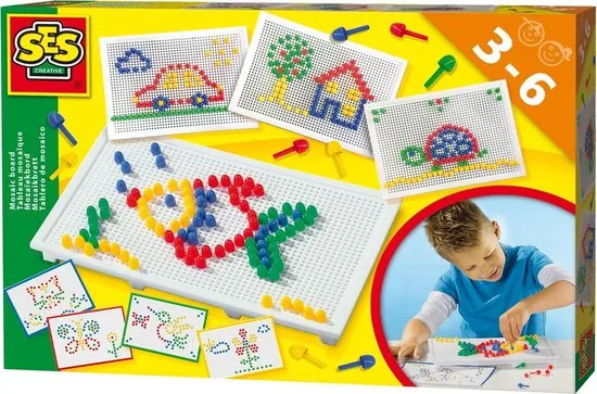 Maak oneindig veel figuren met dit leuke mozaïekbord van SES. De set bevat een heleboel gekleurde pinnetjes in geel, groen, rood en blauw. Leg een kaart op het bord en prik de pinnetjes op de aangegeven plekken. Je kunt het bord natuurlijk ook gebruiken zonder de kaarten en je eigen creativiteit de vrije loop laten. Eigenschappen:- Kwalitatief goed mozaïekbord;- Steeds opnieuw te gebruiken;- Met unieke kaarten;- Knutselen zonder geknoei;- Stimuleert de creativiteit