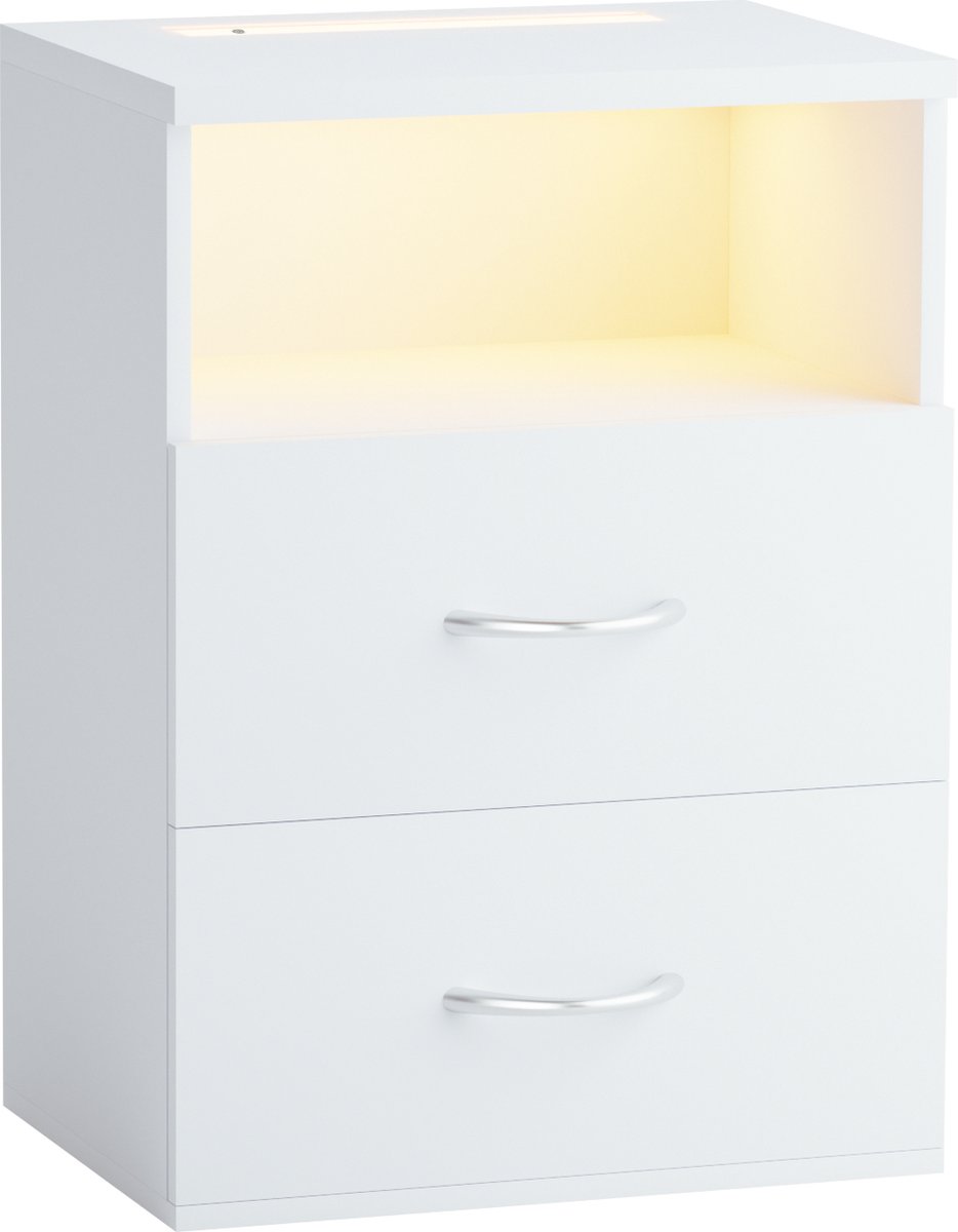 Elegant nachtkastje met geïntegreerde verlichting Het Jamie nachtkastje van CASARIA® met geïntegreerde verlichting is de perfecte metgezel voor gezellige avonden, rustige nachten en zacht wakker worden. Een simpele aanraking van het oppervlak is voldoende om de kamer in een mooi, uitnodigend licht te hullen. Met de elegante touch-technologie wordt je slaapkamer een plek waar je kunt ontspannen en je helemaal op je gemak voelt. Een royale legplank en 2 lades met handgrepen in chroomlook bieden voldoende ruimte voor persoonlijke spullen. Met een comfortabele hoogte van 55 cm is het nachtkastje de ideale aanvulling en kan het vanuit elk bed gemakkelijk worden bereikt. De praktische kabeldoorvoer aan de achterkant van het kastje zorgt voor een opgeruimde, rustige uitstraling. Er wordt ook een USB-stekker type A meegeleverd. De
